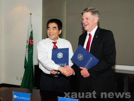May 24 afternoon, the president Academician Xu Delong met with Heynderick and his group. Both sides reviewed the history of cooperation between the two universities, and described the development respectively。President Xu indicated that: with the continuous improvement of the world economy and informatization, the concept of global village has been around, and the 'distance' is getting closer. Cultural blending is the most important aspect between oriental and occidental communication, China stands for oriental civilization and America as the representative of occidental civilization, if both sides facilitate the cultural blending constantly, and there will be a new human civilization. Saint Martin's University has sent excellent English teachers to our university and our President Xu greatly appreciated this collaboration. In addition, he expects that group of 20 students from our university will achieve splendid results in the Saint Martin's University during this summer vacation, also we can have more extensive and deep cooperation in the future. President Heynderick indicates that he is very pleased to see the beautiful XAUAT campus, beautiful library and building square. The year 1895 was significant for the both universities, because the both universities were founded in 1895; the year 2013 is very significant as well, because the two universities will renew the academic exchange agreement. The world is getting smaller, teachers and students from both universities will have more opportunities to go abroad for exchanges, developing their international perspectives and communication abilities and improving the internationalization level of education is one of the crucial tasks of high-level universities nowadays. Then, he hopes that the exchanging cooperation projects between the two universities could be implemented as soon as possible. After the talks, the universities renewed the exchange cooperation agreement. Mr. Pat Rants, Chairman of Saint Martin's University, Ms. Josephine Yung, Vice-president, and Mr. Marco Tulluck, Chief of International Project Department, and Liu Zishi, Director of the Headmaster's Office of our university attended the talks and the signing ceremony.